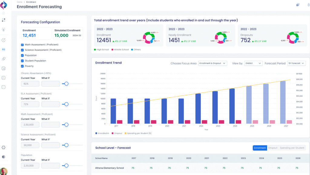 An AI-powered enrollment forecasting dashboard predicts enrollment growth or decline using historical and current data.