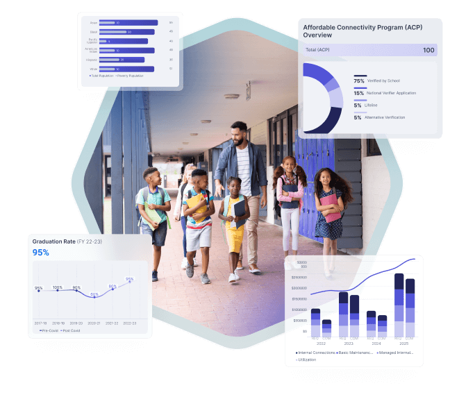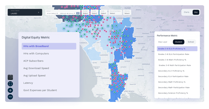 It tracks device availability, broadband connectivity, and student access metrics at the student, school, or zip-code level—overlayed with demographic data for equity-driven insights.