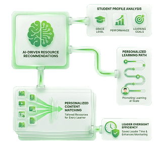 Uses AI to match content with students’ grade level, performance, and learning goals promoting personalized learning at scale while saving leader oversight time.