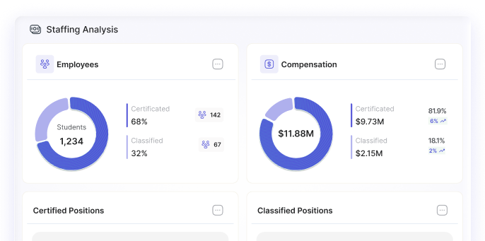 Get a clear picture of how salaries, staffing levels, and FTEs are distributed. Spot imbalances or overages before they become issues.