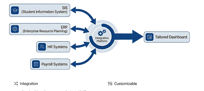 No need to rip and replace. We integrate with your current tools — SIS, ERP, HR, or payroll systems — and tailor the dashboard to your needs.
