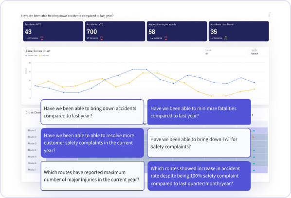 Click into districts, routes, or time periods to explore root causes, trends, and KPIs—directly from the map.