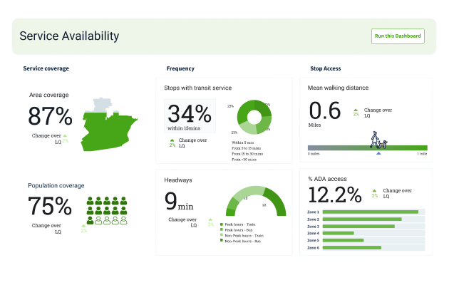 Track ridership, service availability, and on-time metrics across all modes in a unified dashboard.